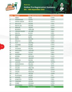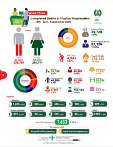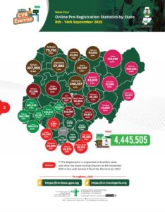 In a press release e-signed by National Commissioner and Chairman, Information & Voter Education Committee, Sam Olumekun, mni, and make available to media on Monday, September 15, 2025, the Commission revealed that as of Sunday, September 14, a total of 4,445,505 Nigerians had pre-registered online within just four weeks of the exercise, which commenced on August 18.