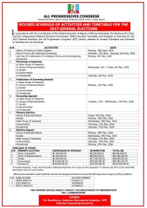 Nigeria’s ruling party, the All Progressives Congress (APC), has released a revised timetable and schedule of activities for the 2027 general elections, outlining key adjustments to its internal processes ahead of the polls.
